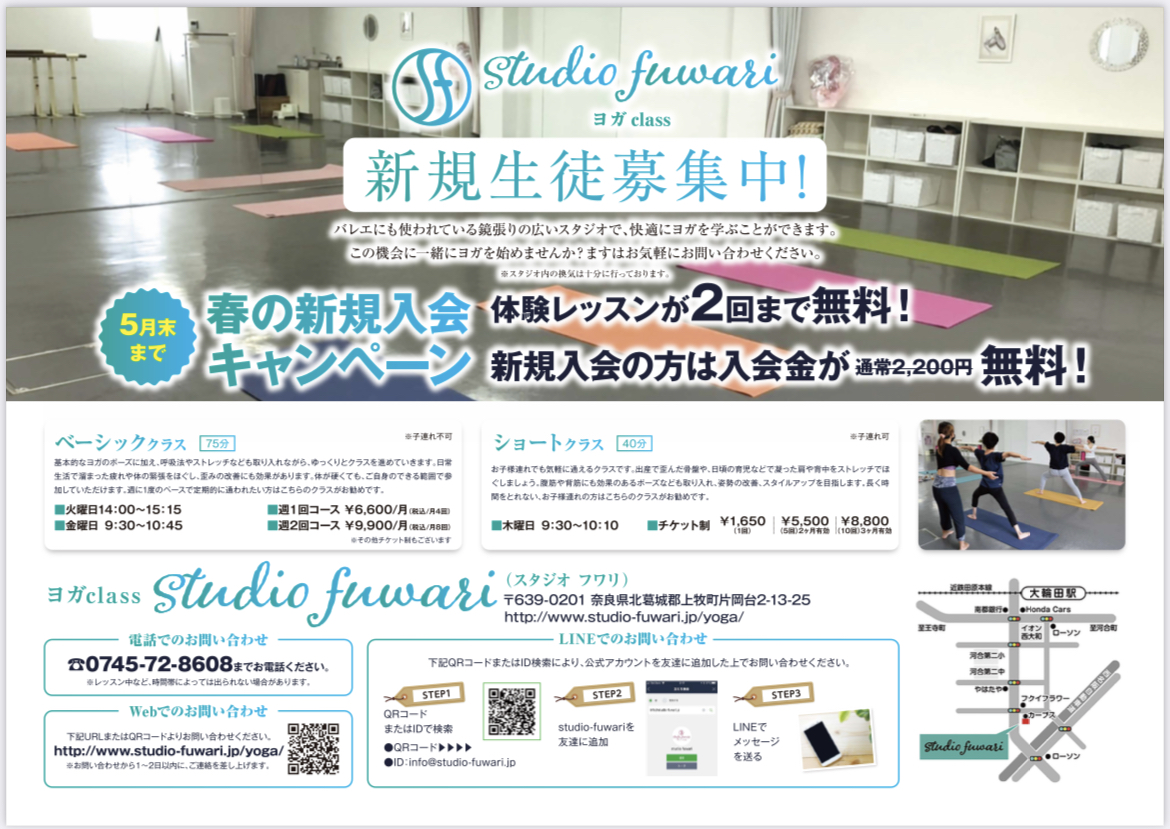 上牧町・王寺町・河合町など周辺地域の方も一緒にヨガを始めませんか?